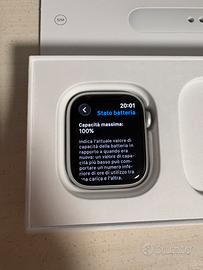 Vendo Apple Watch Serie 8 41 mm GPS Colorazione Silver Alluminium. Con capacitá batteria al 100% completo di scatola, cavo magnetico per ricarica, 4 cinturini,cover di gomma,pellicole protettive. Non trattabile.
