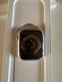 Apple watch serie 8 Silver Aluminum Case da 45 mm in ottimo stato. Nessun segno di usura sempre usato con pellicola. Completo della sua confezione originale con tutti gli accessori. Cinturino Apple sport bianco mai usato.