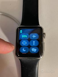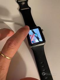 Apple Watch Series 1 in ottime condizioni, con cassa in acciaio inox da 42 mm e cinturino sportivo nero in silicone. Display perfettamente funzionante, batteria ancora efficiente. Ideale per fitness, notifiche e monitoraggio della salute.