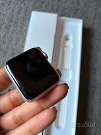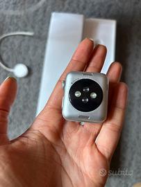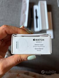Apple watch series 3 SILVER ALLUMINUM 38mm GPS Completo di scatola, caricabatterie e cinturino. !!! Il cinturino in foto che vendo non è originale, ma nella scatola vi è anche quello originale (che è un po rovinato).
