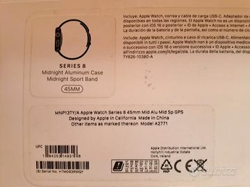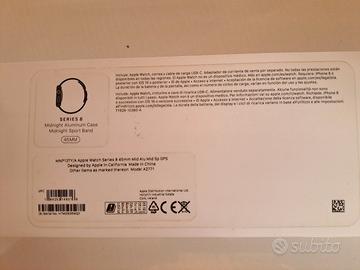 Apple Watch Series 8 45mm NUOVO Cassa in Alluminio Color Mezzanotte GPS completo di cinturino sport e cavo di ricarics USB-C.