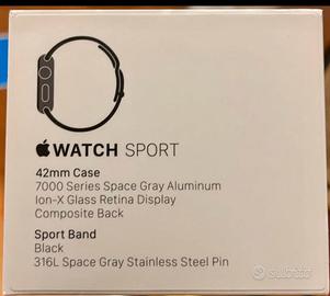 Vendo Apple Watch Sport 42 mm (prima generazione / Series 0), cassa in alluminio space gray con vetro Ion‑X e cinturino sport nero.