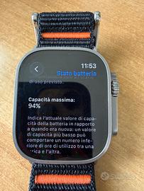 Vendo Apple Watch Ultra 2 49mm cellular, stato batteria al 94%, nessun segno, tenuto come nuovo, con due cinturini, quello originale blu navy ed uno in cordura, più sportivo, con tutti gli accessori (caricabatterie….)
