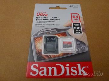 TUTTI PREZZI NON TRATTABILI, PERTANTO NON CHIEDETEMI SCONTI: SanDisk Ultra micro SD/XC 128 GB UHS-I Card with Adapter For better photos and Full HD Video, A1 FOR FASTER MOBILE APP PERFORMANCE, SPEED UP TO 100 MB/S 667X FULL HD VIDEO 10, 10 YEARS WARRANTY, modello SDSQUAR-128G-GN6MA codice EAN 619659160395 acquistata a 100 euro, svendo a 50 euro, SanDisk Ultra micro SD/XC 128 GB UHS-I Card with Adapter For better photos and Full HD Video, A1 FOR FASTER MOBILE APP PERFORMANCE, SPEED UP TO 120 MB/S FULL HD VIDEO 10, 10 YEARS WARRANTY, modello SDSQUA4-128G-GN6MA codice EAN 619659183233 acquistata a 100 euro, svendo a 50 euro, SanDisk Ultra micro SD/XC 64 GB UHS-I Card with Adapter Ideal for Android – powered and other tablets Take better pictures and Full HD video, SPEED UP TO 48 MB/S 320X FULL HD VIDEO 10, 10 YEARS WARRANTY, modello SDSQUNB- 064G-GN6TA codice EAN 619659137939 acquistata a 45 euro, svendo a 20 euro, SanDisk Ultra micro SD/XC 64 GB UHS-I Card with Adapter For better pictures and Full HD video, Includes SD adapter for easy file transfer, SPEED UP TO 100 MB/S 667X 10 FULL HD VIDEO, 10 YEARS WARRANTY, modello SDSQUAR-064G-GN6IA codice EAN 619659161491 acquistata a 55 euro, svendo a 25 euro e SanDisk Ultra micro SD/XC 64 GB UHS-I Card with Adapter For better pictures and Full HD video, Includes SD adapter for easy file transfer, SPEED UP TO 120 MB/S, Compatible with SanDisk MobileMate USB 3.0 microSD Card Reader for speeds up to 120 MB/S, 10 FULL HD VIDEO, 10 YEARS WARRANTY, modello SDSQUA4-064G-GN6IA codice EAN 619659182175 acquistata a 55 euro, svendo a 26 euro. Preferisco volentieri di gran lunga la consegna a mano in zona. Provvedo ad aggiornare tutti i prodotti ed a eliminare dall’elenco quelli venduti.Se li trovate sono sicuramente disponibili e potete evitare di chiedermelo tramite messaggio.Sono intento a svendere tutto quanto possiedo per riuscire sommariamente a fronteggiare e sostenere le ingenti spese mediche specialistiche richiestemi per curare