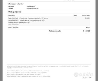 Cuffie auricolari in ear della Beats colore nero. Acquistate a giugno 2025, ancora in garanzia (allego fattyra di acquisto Amazon). Pagate 159 euro senza offerte, come da fattura, vendo. 40 euro perchè non riesco più ad usare questo tipo di auricolari in ear. Usate ma in perfetto stato (solo un segno sul frontale della custodia di ricarica).