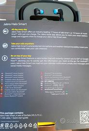 Vendo per inutilizzo auricolari bluetooth Jabra modello Halo Smart! Si possono tenere comodamente appesi al collo grazie al sostegno d'appoggio e utilizzare all'esigenza le cuffiette! Comodo soprattutto per un utilizzo di lavoro o sport se non si ama avere sempre gli auricolari inseriti nelle orecchie così da non riporre ogni volta gli elementi nella custodia! Resistono fino a 17 ore per chiamate e 15 ore per ascolto musica! Resistenti ad acqua e vento! Acquistati da Mediaworld a € 89.99
