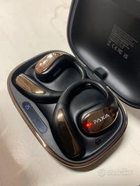 Questi sono auricolari PAXA Vogbuds 5Pro, un modello di auricolari wireless di tipo open-ear. Design: Utilizzano un archetto che si aggancia sopra l'orecchio, lasciando libero il condotto uditivo per una maggiore consapevolezza dell'ambiente circostante. Funzionalità AI: traduzione in tempo reale tramite app con 134 lingue. La custodia di ricarica è dotata di un display LED che mostra la percentuale della batteria. Connettività: Supportano il Bluetooth 5.4 e offrono funzionalità di riduzione del rumore durante le chiamate.