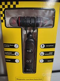 Auricolare wireless progettato per l'attività fisica. Connessione wireless compatibile con dispositivi Android e iPhone. Include un microfono integrato per chiamate in vivavoce e una funzione di riduzione del rumore. Dotato di una funzione di attrazione magnetica per tenere insieme gli auricolari quando non in uso.