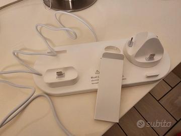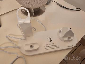 La confezione non prevede il caricabatterie, ma solo il cavo USB da collegare al caricatore. Può ricaricare uno smartphone sulla base rotante con più Jack, gli auricolari, un altro dispositivo in modalità wireless e lo smartwatch, ma per quest'ultimo va collegato ed incastrato il caricatore originale.