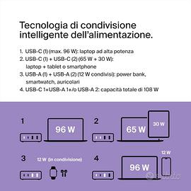 - La condivisione intelligente dell'alimentazione rileva le esigenze di alimentazione dei dispositivi ed eroga l'energia di conseguenza per un massimo di 4 dispositivi;