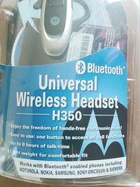 Auricolare Motorola H350 Bluetooth. Offre fino a 8 ore di conversazione. Leggero (circa 17 grammi), con gancio regolabile per orecchio destro o sinistro. Pulsante singolo per gestire tutte le chiamate. Funziona con telefoni dotati di tecnologia Bluetooth, inclusi marchi come Motorola, Nokia, Samsung, Sony-Ericsson e Siemens.