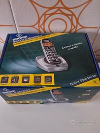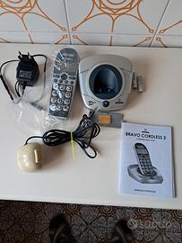 Cordless Dect funzionante, con incluso alimentatore, cavo e spina presa telefonica, batterie ricaricabili, manuale istruzione e confezione originale. Come da foto, il cavo dell'alimentatore è stato riparato perché si era strappato.