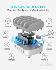 La base con slot è solida e supporta fino a 5 dispositivi con una potenza totale di 40 W, con un carico su una porta massima di 5V2.4A.