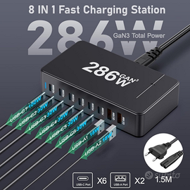 Caricatore USB multipresa Supporto PD (power delivery) e QC (quickcharge) Possibilità di ricaricare anche pc portatili compatibili con PD, macbook ecc ✅Prodotto completamente nuovo e mai utilizzato✅ 286W scritta sul prodotto non è la potenza effettiva ma la somma degli output massimi raggiungibili da ogni singola presa. 1 USB Type-C con supporto PD 100W 5 USB Type-C con supporto PD 30W 2 USB Type A con supporto QC 18W