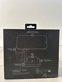 Ricarica wireless per tre dispositivi contemporaneamente. MagSafe garantisce una ricarica rapida fino a 15 W per iPhone 12 e successivi. Ricarica anche l'Apple Watch. Porta USB-C da 18 W per un quarto dispositivo. Realizzato in alluminio di alta qualità. Include alimentatore da 45W USB-C PD. Prodotto mai usato. Costo ufficiale: €149.