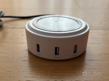 Vendo caricatore wireless SoundLogic con 3 porte USB da 2.1A, alimentazione multi-tensione 110-220V. Ideale come stazione di ricarica versatile per smartphone/tablet con compatibilità Qi (ricarica wireless), o per dispositivi USB tramite le porte tradizionali. Perfetto per uso quotidiano in casa, ufficio o viaggio.