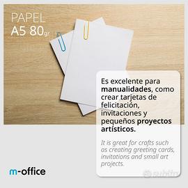 m-office: Carta A5 Multifunzione, 5000 Fogli da 80 g, 2 Scatole Carta: la carta m-office ha una dimensione A5 (148x210mm), ha un peso di 80gr e ogni confezione contiene 5000 fogli bianchi. Realizzata con materiali durevoli che garantiscono un'eccellente qualità di stampa e scrittura su ogni pagina. Varietà di Usi della Carta: uno degli usi principali della carta è per la stampa di documenti, per la scrittura e il disegno, per l'istruzione e la formazione...ecc. La carta A5, con le sue dimensioni di 14.8 x 21 cm, è ideale da portare in borse e zaini, il che la rende perfetta per prendere appunti rapidi durante riunioni o lezioni. Carta Multifunzionale: la carta A5 è anche un formato popolare per prendere appunti, disegnare e fare schizzi. È compatibile con la maggior parte delle stampanti domestiche e per ufficio, permettendo di stampare documenti, rapporti e opuscoli senza problemi di dimensioni. Perfetta per Lavori Quotidiani e di Ufficio: la sua dimensione compatta è perfetta per l'uso in diari personali, agende e quaderni di pianificazione, aiutando a organizzare le attività quotidiane e gli obiettivi a lungo termine. Con Certificazioni Ambientali: i fogli dispongono della certificazione FSC (foreste gestite in modo responsabile) e sono 100% riciclabili. Impegnati per l'ambiente.