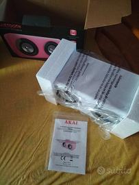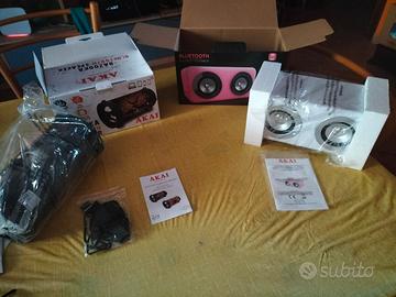 Vendo 2 casse attive per cellulare, tablet ecc ,nuove mai usate ancora da configurare e ancora imballate marca akai di diversa tipologia di forma e funzionamento, entrambe amplificate, collegamento tramite sia bluetooth oppure aux con cavetto dedicato, entrambe con batterie ricaricabili incorporate. Accessori inclusi per entrambi ( cavetto aux e cavetto USB per la ricarica batterie). Libretti istruzioni inclusi. Quella a forma circolare ( tipo mini bazooka) è provvista anche di cinghietta per il trasporto a tracolla. Invece quella rettangolare è provvista anche di 6 luci colorate ( bianco, blu, rosso, verde, celeste, viola, giallo ) che si accendono o in sequenza scegliendo il colore desiderato che rimane fisso con selettore posto sul retro o a ritmo ( sempre selezionando selettore). Volendo quella rettangolare si può usare anche come lampada senza azionare la musica. Volendo si possono usare anche in macchina col Cell ( per chi non avesse autoradio) o all'aperto, camping ecc ecc... Il bluetooth ha una portata di 10 metri circa per entrambe. Tasto on/off su entrambe . La potenza è 3+3 watt in stereo per quella rettangolare e 5 watt in mono per quella cilindrica. 15 euro quella circolare e 20 quella rettangolare. In blocco o separatamente ma preferisco in blocco. Ritiro a mano. NON SPEDISCO.