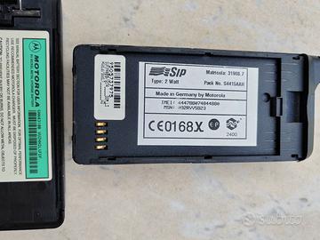 all'interno leggesi: SIP TYPE 2 WATT = matricola 31908.7 = PACK NO: S4415AAH = made in Germany by Motorola = IMEI: 444788074844880 = MSN: 092RVV5B23 = CE 0168X 2400 9505737975 = SUF 1944BB/0174 GSM L3 = HW: 1.6/SW: 1.7 W2 = con batteria MOTOROLA 6V nichel metal hydride battery = SNN 4310B VUZHH2L%FDF = con due batterie di scorta SBS (una Mod Motorola MM54050 6V 550 mAh e l'altra Mod Motorola MM54090 CV 900 mAh) = la parte alta dell'antennina estraibile non è perfetta