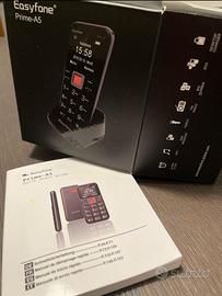 Easyfone Prime-A5 Telefono Cellulare Nero con Tasti Grandi, Funzione SOS, Batteria di grande con base di ricarica, radio FM, MP3, SMS message, torcia, manuale, display dotato della sua protezione originale. Omaggio del porta cellulare auto.