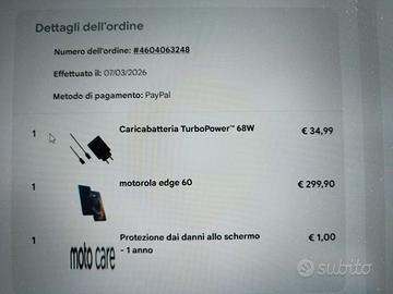 Vendo cellulare MOTOROLA EDGE 60 Blu ed accessori inclusi nella confezione + CARICABATTERIA TURBO POWER 68 W comprati circa un mese fa nuovi sul sito ufficiale Motorola ed usati per non piu' di una settimana quindi quasi nuovi con un anno di garanzia perchè aziendale. Prezzo pagato Euro 335,89. Posso spedire con commissioni a carico del compratore.