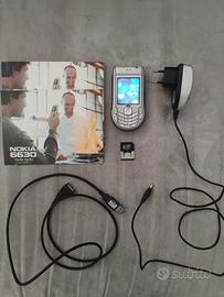 Cellulare Nokia 6630 colore grigio perfettamente funzionante e in ottimo stato d'uso, nessun danneggiamento e batteria perfetta. È completo di cavo di ricarica da rete, cavo usb dati originale, scheda di memoria MMC Kingston 512 mb e manualistica.