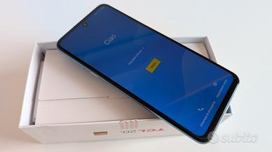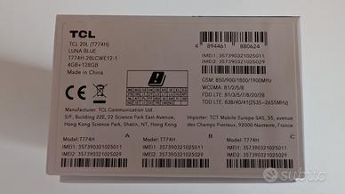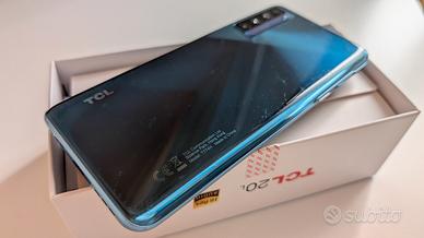 Smartphone TCL 20L colore Luna Blue fornito con scatola e istruzioni originali, tool rimozione SIM, caricatore e cavo Micro USB, cover in silicone. Il display è perfetto, esente da difetti, mentre la plastica posteriore presenta dei segni di utilizzo ben visibili in controluce. La batteria del telefono è in buone condizioni e tiene bene la carica. La cover in silicone ha evidentemente l'aspetto di una cover usata. Per le caratteristiche tecniche vedere le foto della scatola. Il telefono è venduto con formula "visto e piaciuto".