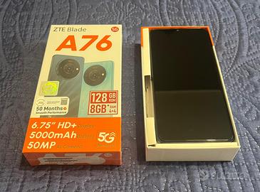 Cellulare ZTE Blade A76 , 5G nuovo di pacca (ancora chiuso ed impellicolato, quello aperto è il mio, giusto per mostrarvelo) con 128 GB di memoria, Display HD+ e 50MP AI Camera. Colore Nero effetto brillante. Nella scatola troverete inclusa anche cover trasparente e pellicola vetro anteriore. Caricabatterie invece non incluso (se avete quelli stile Android vanno bene).