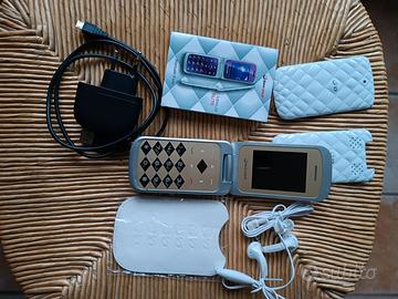 Poi c'è un cellulare Glamour modello Venus con cover oro + una cover di ricambio color bianco ed una custodia in similpelle bianca. Ha i suoi auricolari ed il caricabatterie però non ho la batteria in quanto quella che c'era non era più funzionante. Ricordo però che quando ho cambiato cellulare ancora funzionava. È un telefono che può funzionare con doppia SIM ed ha alloggio per una memory card.