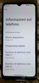 Cellulare smartphone Nokia G21 condizioni usato con ammaccatura al vetro (messa pellicola aggiuntiva) . Processore Unisoc T7255 8core 1.6, grafica Mali-G57. Memoria interna 128Gb di lavoro 4Gb. Fotoamera 50Mpx posteriore 8Mpx anteriore. Sistema android 13.