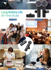 Due 2 Microfoni wireless per smartphone Android/Apple con ricevitore con connessione USB-C. Ideale per registrazioni audio di alta qualità. - Supporta la connessione di due microfoni contemporaneamente. - Include accessori per la riduzione del rumore del vento. - Compatibile con dispositivi Android e Apple tramite USB-C.
