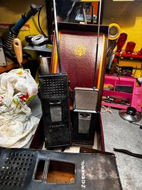 Per collezionisti di elettronica d'epoca e amanti del design industriale. Coppia di ricetrasmittenti marca GENERAL, complete delle loro iconiche custodie protettive in cuoio nero e scatola originale.