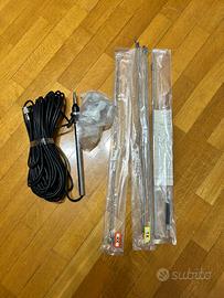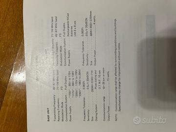 5watt il portatile 15 watt base portata 5-7 km a seconda del posto completo di antenna mai usata (ne avevo installata una piu grande per aumentare la portata )essendo datato da sostituire il pacco batterie