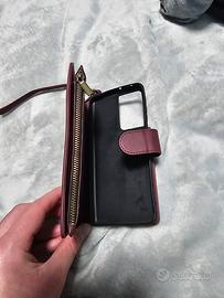 cover in ecopelle rosso scuro a portafoglio con portamonete oltre porta documenti più posta banconota. richiudibile con calamita oltre cerniera per portamonete più portachiavi con gancio
