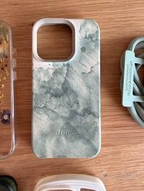 4 cover usate per iPhone 15 Pro: - Trasparente con fiori in resina - Change (con laccio tracolla removibile) - Armov con MagSafe - Trasparente/bianco antishock