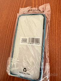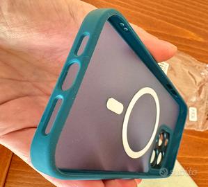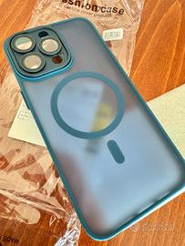 Custodia per iPhone 15 pro max, nuova, mai usata, con protezione lenti fotocamera. Colore blu chiaro.