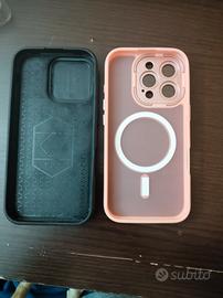 Vendo due cover iPhone 16 pro , una cover con carica batteria wireless (quella rosa) e quella nera cover rigida (nera)