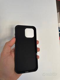 Cover nera opaca con supporto MagSafe per iPhone, dettagli arancioni e finitura soft-touch. Design elegante e compatibilità totale con ricarica wireless e accessori magnetici.