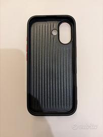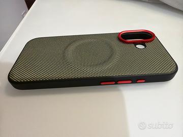 Cover nuova rigida Magsafe colore verde e nera. Parte posteriore con rilievo finto tessuto/trama con tasti proteggi camera colore rosso flash.