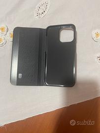 Cover per hi-phone 14 pro max rivestita in pelle nera . Modello a portafoglio . Nelle foto sono visibili la facciata esterna e quella interna . Non è mai stata usata. La fornisco nella bustina in cellophane originale