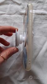 Usata ma ancora in ottime condizioni (solo qualche piccolo graffietto visibile in controluce). Cover per I Phone XS di plastica con gancio a forma di cuore, a fantasia "marina" colore blu celeste bianco e beige.