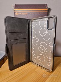Kit nuovo contenente una cover pieghevole per iPhone XR e un vetro temperato per iPhone XR. La cover è in ecopelle premium, ha 2 slot per carte, 1 per fototessere e 1 per banconote, si trasforma in uno stand quando è aperta e ha una chiusura magnetica.