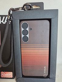 Cover PITAKA per Samsung Galaxy S25+ - Design Tactile Woven. - Colore sfumato dal blu al rosso effetto tramonto. - Struttura in fibra aramidica resistente e leggera. - incluso cordino porta cellulare