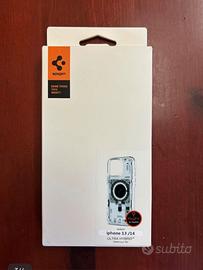 Vendo questa custodia Spigen Ultra Hybrid, compatibile con iPhone 13 e 14, con tecnologia MagSafe. Si presenta in ottime condizioni, nuova e nella sua confezione originale. - Design trasparente e sottile. - Compatibile con ricarica wireless MagSafe. - Protezione ibrida resistente.