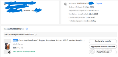 Vendo rugged smartphone Cubot KingKong Power 3 in condizioni praticamente perfette. Vendo lo smartphone perfettamente funzionante acquistato il 10 Dicembre 2025. Vendo lo smartphone originale assieme a scatola originale, caricatore originale (cavo usb-c/usb-c e caricabatterie).