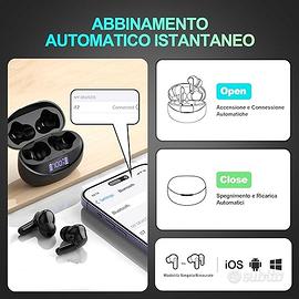 CUFFIE BLUETOOTH, AURICOLARI BLUETOOTH 5.3 STEREO HiFi IMMERSIVO BASSI EXTRA SPEDIZIONE RAPIDA!!! DESCRIZIONE - Suono Hi-Fi e 5-7 h per tre volte di Riproduzione: Con driver da 13mm, queste cuffie Bluetooth danno alti chiari e bassi profondi. Grazie alla tecnologia CVC, riducono l'85% del rumore. 21 ore di prestazioni costanti in viaggio, lavoro o relax. - Design Ergonomico e Leggero: Con 3 dimensioni di tappi in silicone morbido, queste auricolari bluetooth offrono una calzata personalizzata. Pesando solo 3,8g, garantiscono comfort per un uso prolungato. Realizzati con nanomateriali ultraleggeri, le cuffiette Bluetooth resistono al sudore e alla pioggia, ideali per l'uso quotidiano come camminare, correre e fare esercizio - Connessione Bluetooth 5.3 Stabile e Accoppiamento Automatico: Grazie all'ultima tecnologia Bluetooth 5.3, queste cuffie wireless offrono una connessione stabile e una trasmissione rapida fino a 15 metri di distanza. Basta aprire la custodia di ricarica, estrarre le cuffie e si sincronizzeranno subito con il tuo dispositivo. - Lo Schermo LED Mostra la Carica in Tempo Reale: Lo schermo LED sul guscio può mostrare contemporaneamente lo stato di carica della custodia di ricarica e dei due auricolari. Questo design facilita notevolmente agli utenti di conoscere lo stato di carica del dispositivo in qualsiasi momento ed evita gli inconvenienti causati dalla carica insufficiente durante l'uso. - Controllo Touch Sensibile & Compatibilità Universale: Tocca le cuffie per chiamare, mettere in pausa, cambiare brano, regolare il volume o attivare Siri. Grazie alla loro ampia compatibilità, si collegano facilmente a qualsiasi dispositivo Bluetooth, come telefoni, tablet, PC, e TV. SPECIFICHE - Tempo di Ricarica Cassa: 1 Ora e 30 - Tempo di Ricarica Cuffie: 1 Ora - Tempo di Ascolto: 5-7 Ore per 3 volte INCLUSO NELLA CONFEZIONE 2 x Auricolari (dx e sx) 1 x Cassa di Ricarica 1 x Cavo di Ricarica 1 x Manuale Utente