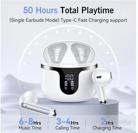Display LED Della Datteria e 50 Ore dl Riproduzione: Gli cuffie wireless bluetooth possono riprodurre musica per 8 ore con una singola carica, e grazie alla custodia di ricarica inclusa, l'autonomia totale arriva a 50 ore. Il cavo USB-C raddoppia la velocità di ricarica, consentendo alla custodia di ricaricarsi completamente in soli 1,5 ore. Gli auricolari wireless sono dotati di indicatori LED che mostrano con precisione la carica residua della custodia