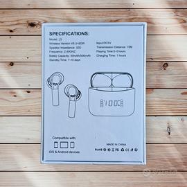 Cuffie Bluetooth ancora sigillate, compatibili con iOS e Android, tempo di ricarica 1h, tempo di utilizzo 5/6 ore, batteria degli auricolari 50mAh, batteria del case 500mAh