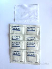 Protezione lenti, otto salviette umide per pulizia lenti, 1 pezzetta in microfibra per pulizia lenti.