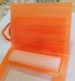 Con chiusura e apertura a serpentina, e feltro a strappo. Colore arancione vivo.